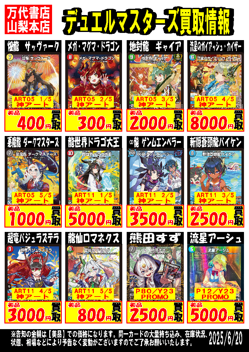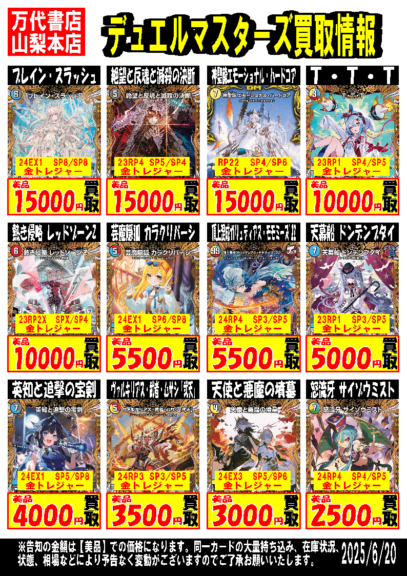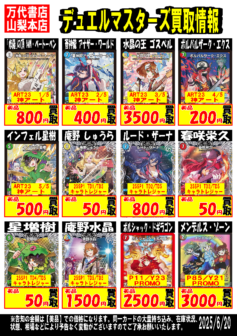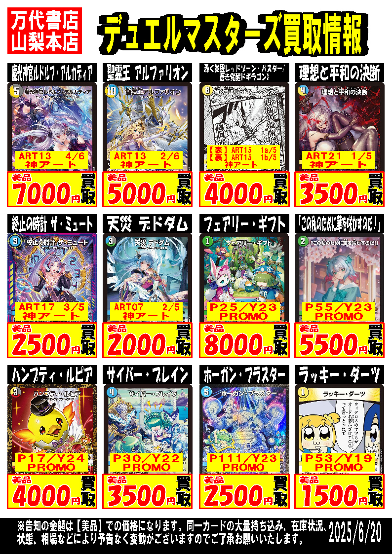 2025.06.20 買取告知 yamanashi デュエルマスターズ 買取告知 ★カードコーナーより★ デュエルマスターズ 強化買取中!! 買取お待ちしてます!! ※2025/6/20 現在の価格となります。 状態や在庫状況などによってお値段が変動いたします。予めご了承ください。 カードを売るなら万代書店山梨本店! 〒400-0117 山梨県甲斐市西八幡4415 TEL:055-260-7021