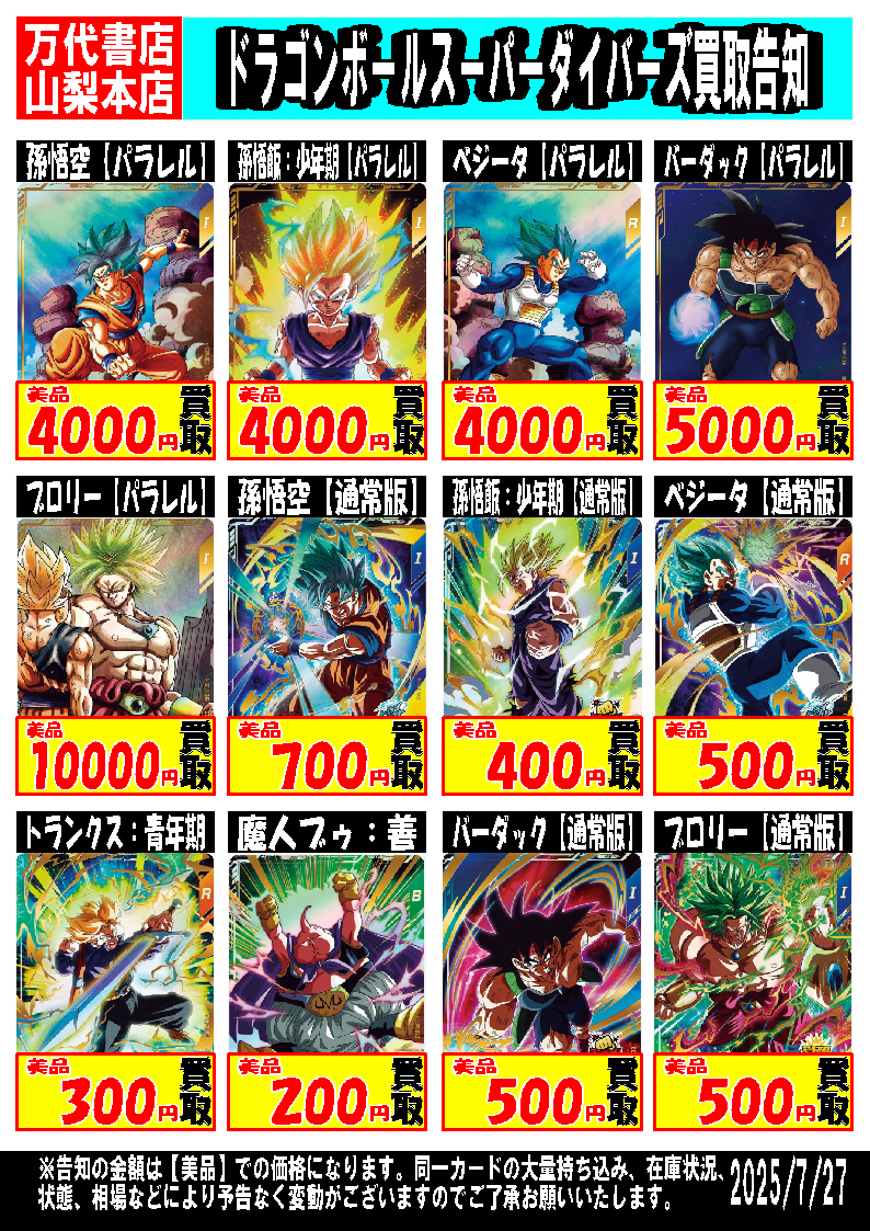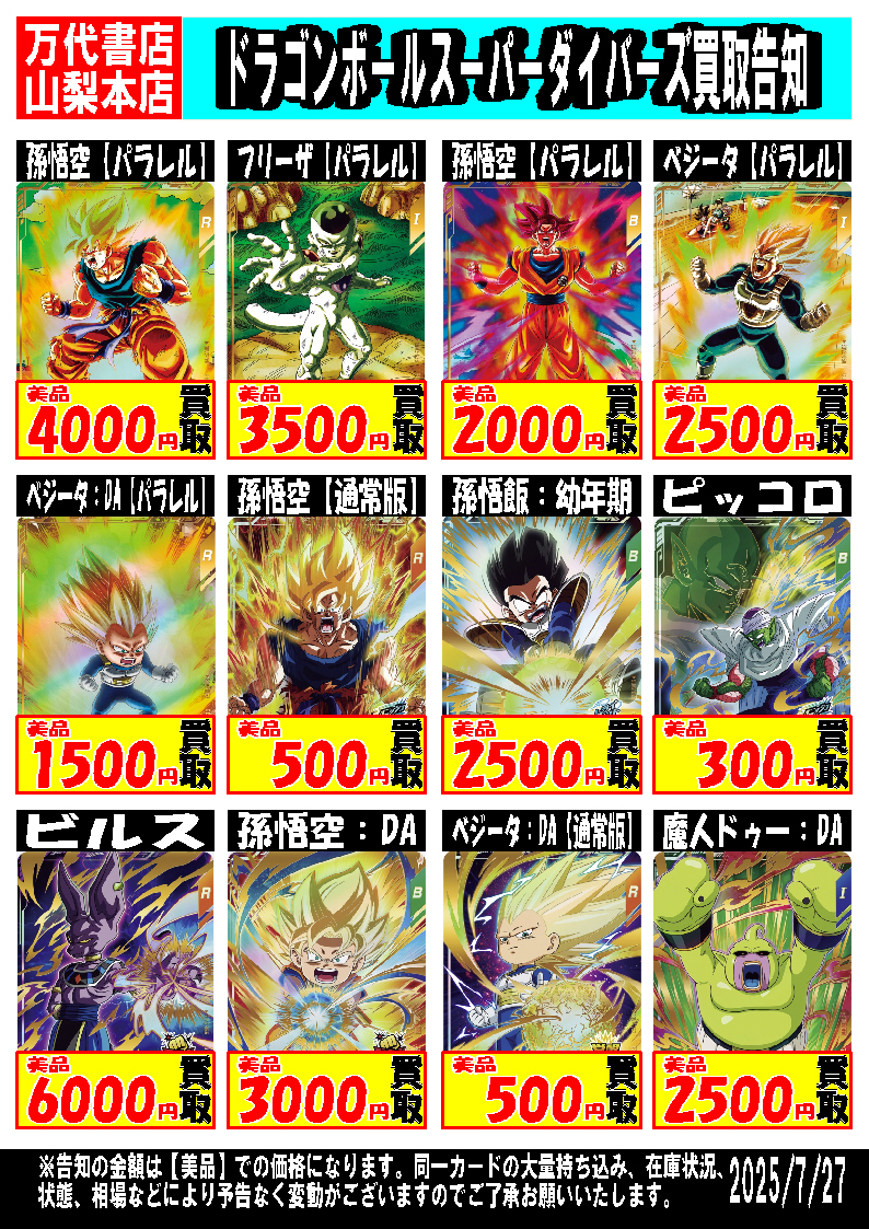 2025.07.27 トレカ yamanashi ■ドラゴンボールスーパーダイバーズ強化買取中!!■ カードコーナーより ドラゴンボールスーパーダイバーズ強化買取中!! 買取お待ちしてます!! ぜひ、お持ち込み下さい!! カードを売るなら万代書店山梨本店! 〒400-0117 山梨県甲斐市西八幡4415 TEL:055-260-7021