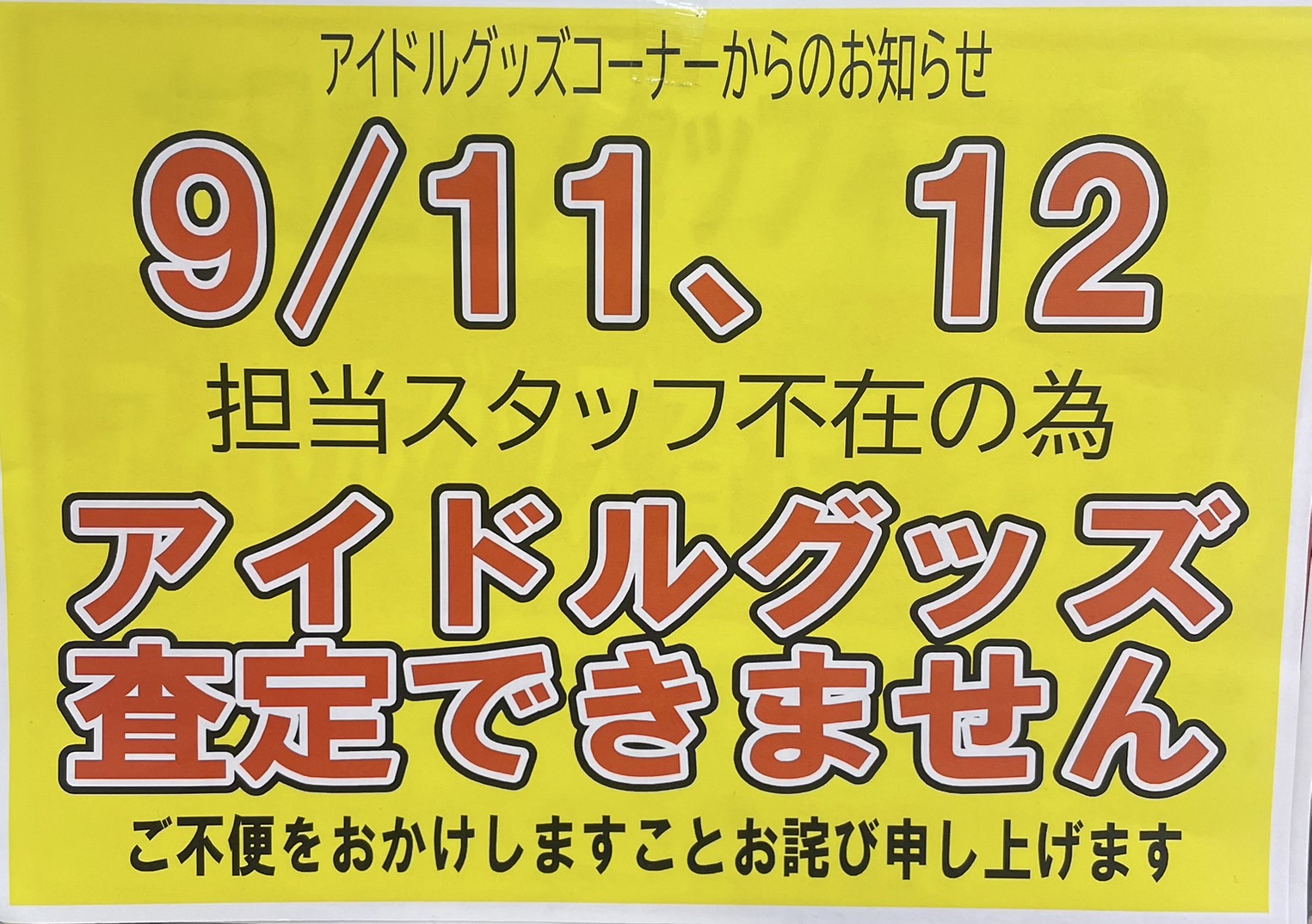 2025.09.11 お知らせ takalab_3 9月11日と12日はアイドルグッズ担当が不在の為買取査定が出来ません CDコーナーよりお知らせ 9月11日と12日はアイドルグッズ担当が不在の為買取査定が出来ません 大変ご迷惑をおかけしますがご理解とご協力をお願いします なお次回査定可能日時は13日(土)9時30分から16時30分の予定となっております(場合により変更する事がございますので一度お電話にて確認をお願い致します)