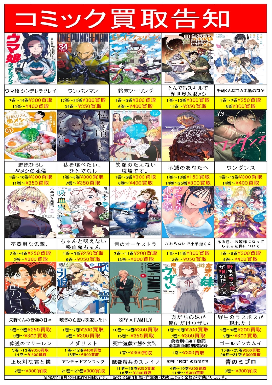 2025.09.22 買取告知 takalab_1 2025年秋アニメのコミックを強化買取中! コミックコーナーより 2025年秋アニメのコミックを強化買取中! コミックの買取は万代書店山梨本店にお任せください!