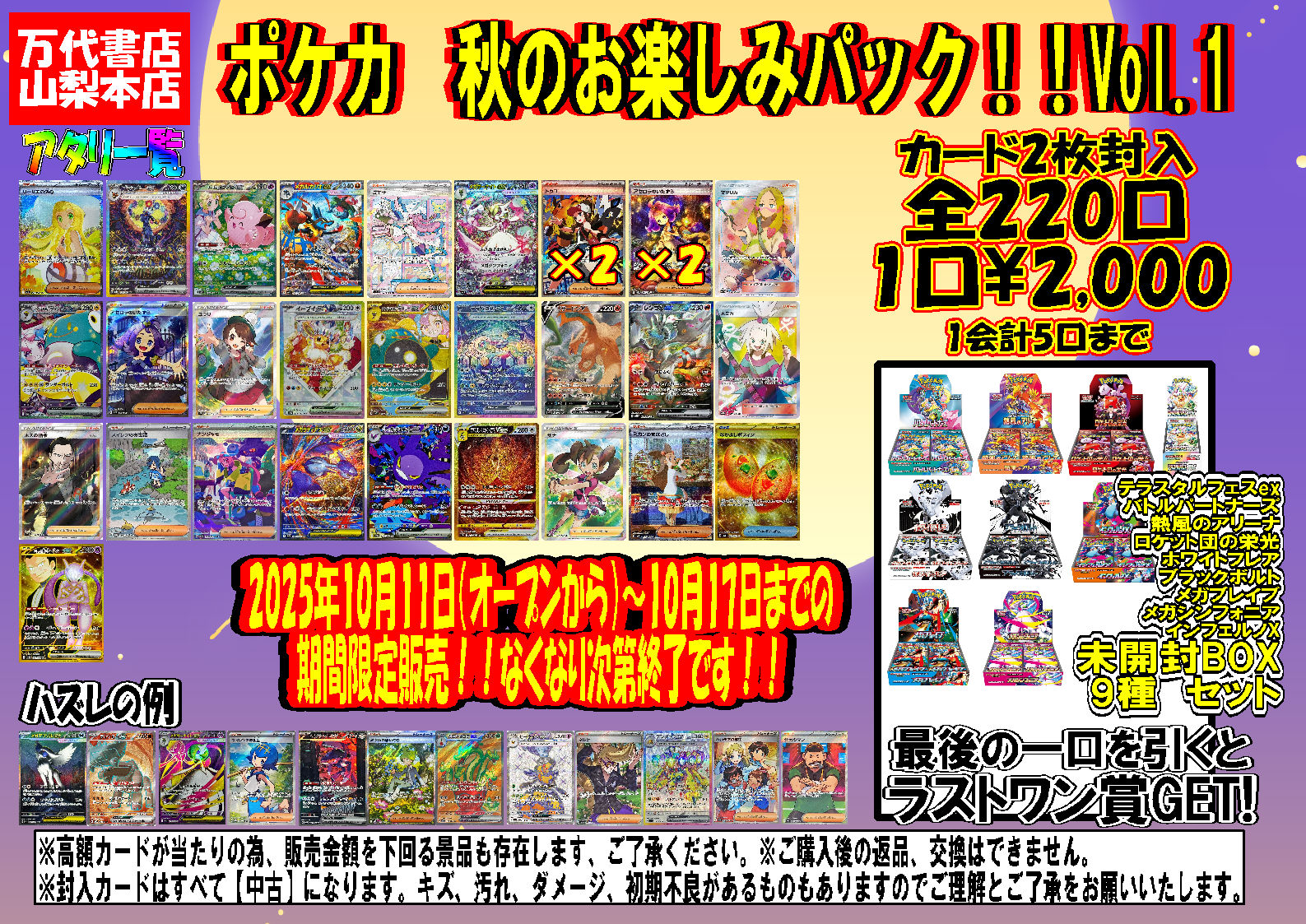 2025.10.10 カード yamanashi 【ポケモンカード】ポケカ 秋のお楽しみパック!!Vol.1!!! 【オリパ】【10/10更新】 ちゃろ~! カード担当ヤッピーです! 秋のお楽しみパック!!Vol.1 販売決定!!! 10月11日オープンから10月17日まで、ショーケースにて販売いたします! カードを売るなら万代書店山梨本店! 〒400-0117 山梨県甲斐市西八幡4415 TEL:055-260-7021
