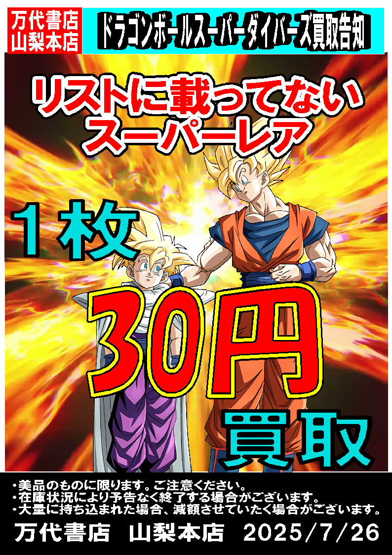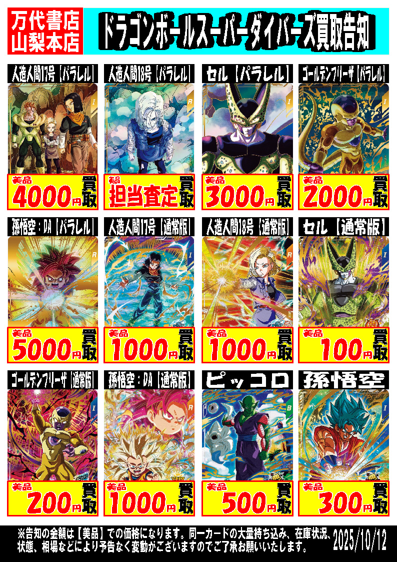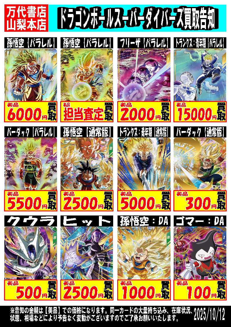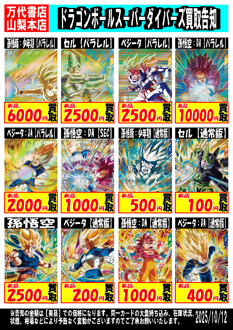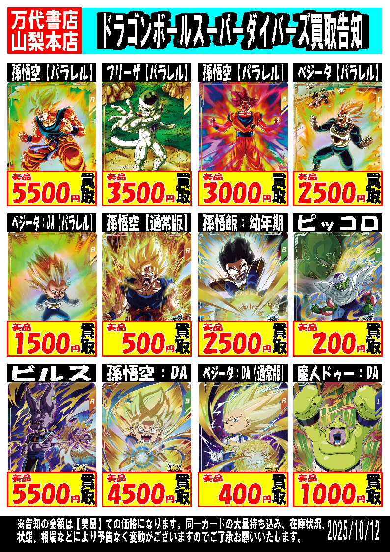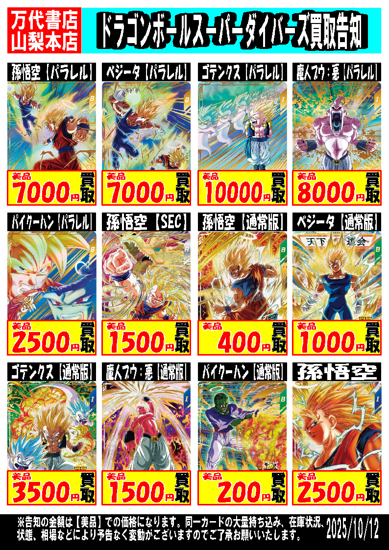 2025.10.12 トレカ yamanashi ■ドラゴンボールスーパーダイバーズ強化買取中!!■ カードコーナーより ドラゴンボールスーパーダイバーズ強化買取中!! 買取お待ちしてます!! ぜひ、お持ち込み下さい!! カードを売るなら万代書店山梨本店! 〒400-0117 山梨県甲斐市西八幡4415 TEL:055-260-7021