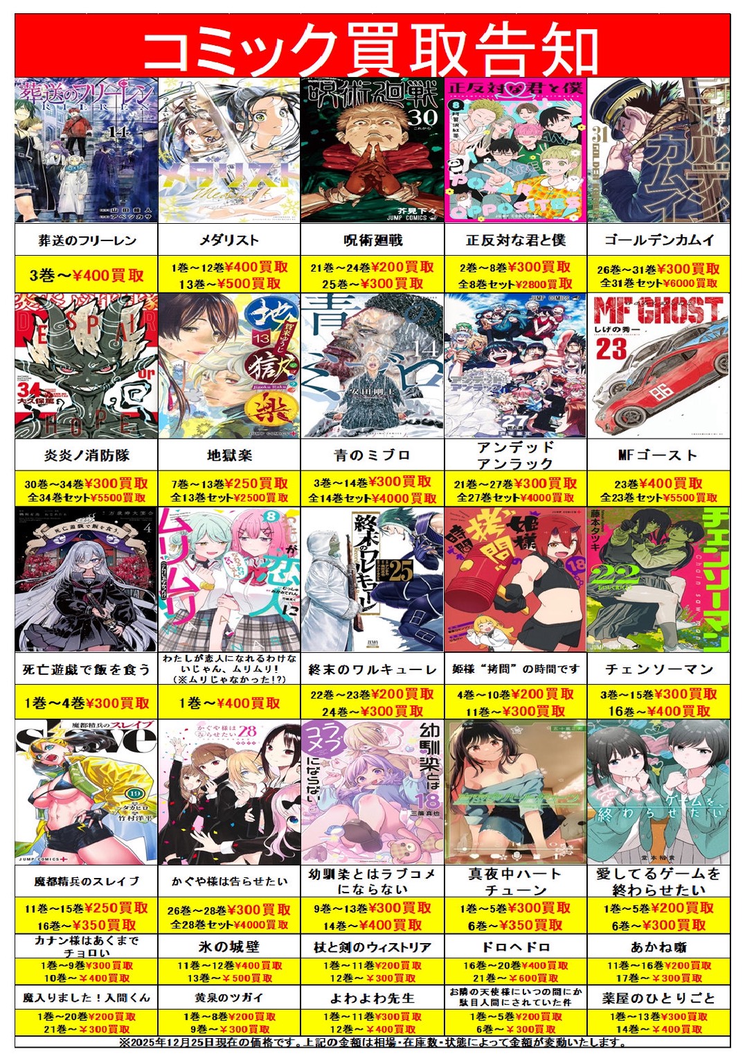 2025.12.25 買取告知 takalab_4 ☆★2026年冬アニメや劇場版のコミックを買取します!★☆ コミックコーナーより 2026年冬アニメや劇場版のコミックを買取します! 全巻セットの買取もしていますのでコミックの買取は万代書店山梨本店にお任せください! ※2025/12/25現在の価格となります。 在庫状況・状態によってお値段が変動いたします。予めご了承ください。 **************** こちら↓もぜひチェックしてみてくださいね♪(*´▽`*) ・最新のイベント情報はこちら ・最新の買取情報はこちら