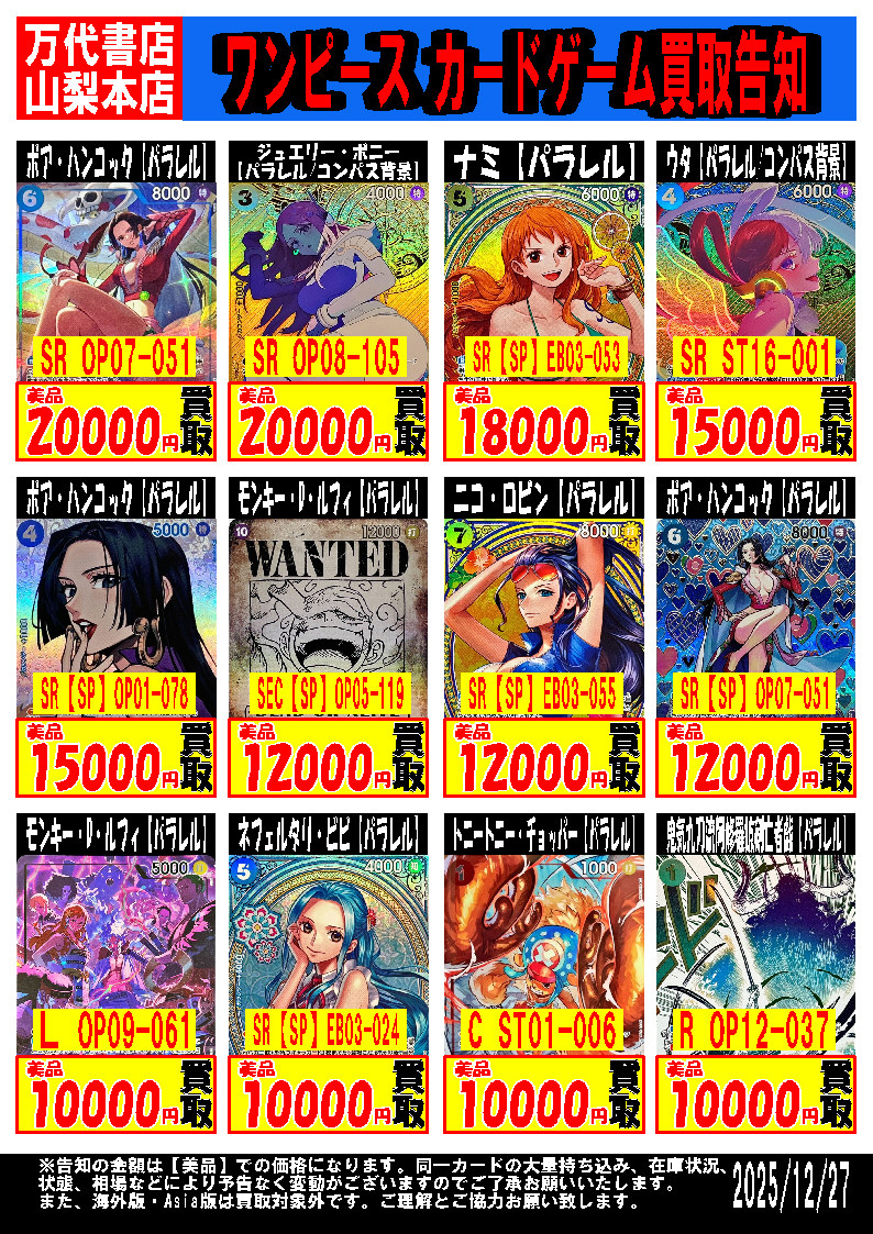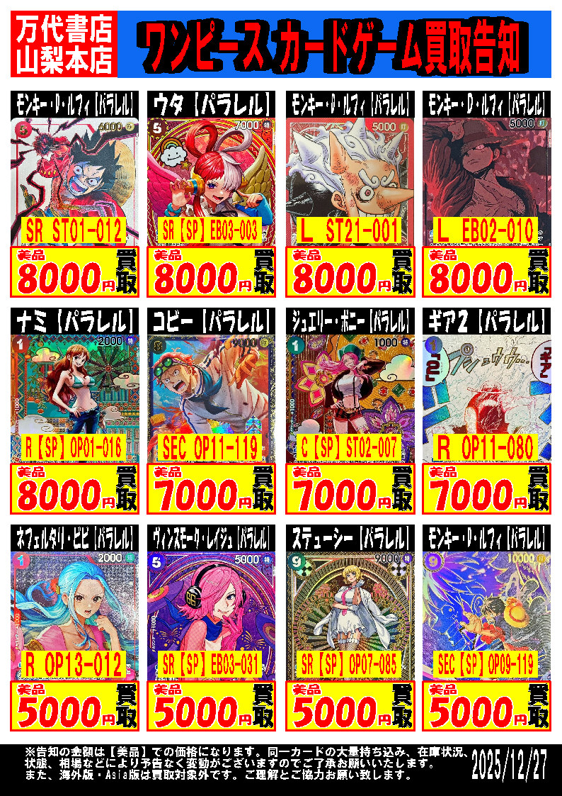 2025.12.27 カード yamanashi ワンピースカード 買取告知 ワンピースカード買取告知です 買取金額UPしました!! 表記外のカードも一部買取金額UPしてます!! カードを売るなら万代書店山梨本店! 〒400-0117 山梨県甲斐市西八幡4415 TEL:055-260-7021