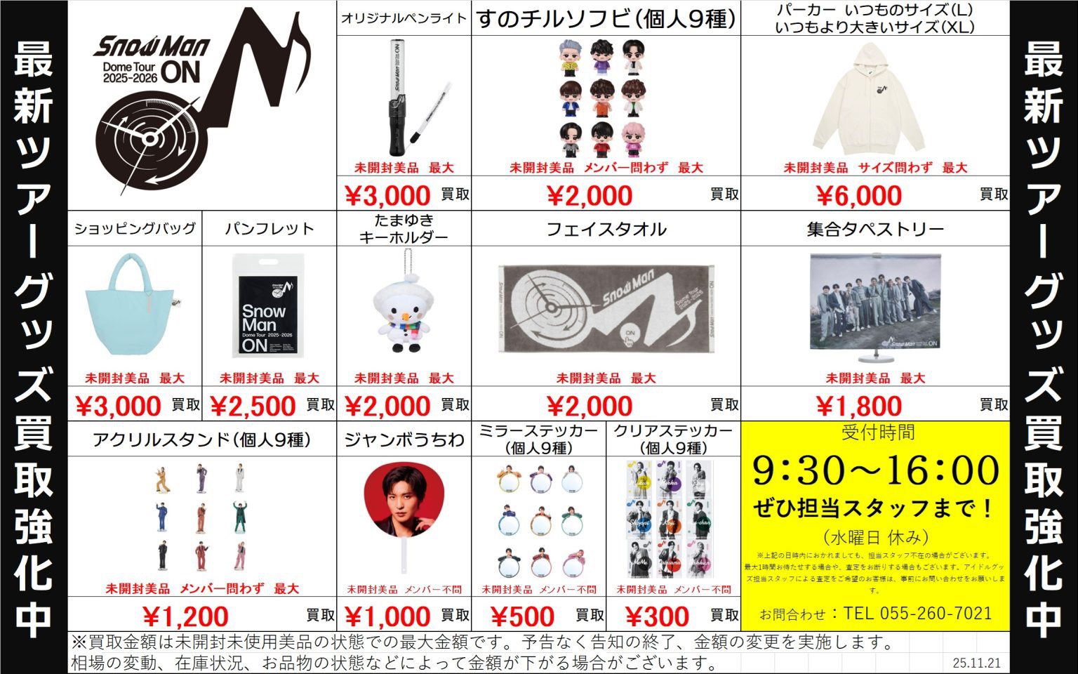 SixTONES最新ツアーグッズやSnowManなども買取してます!