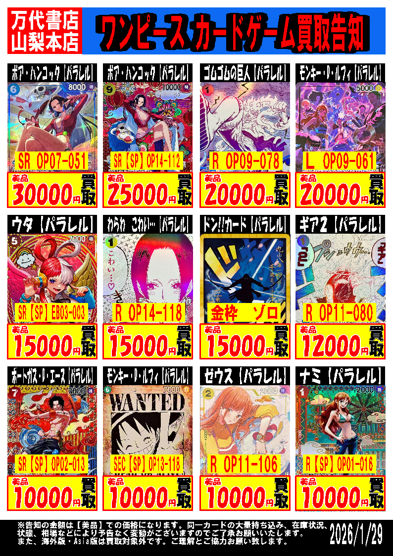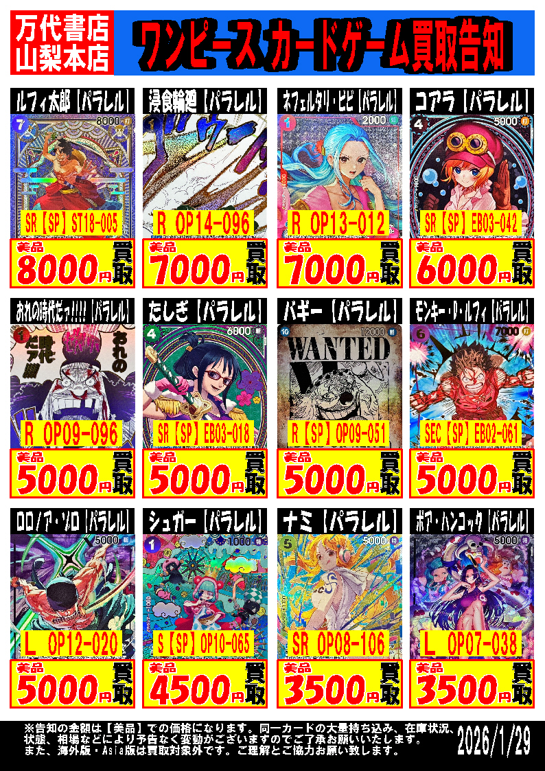2026.01.29 カード yamanashi ワンピースカード 買取告知 買取リストを大幅に更新しました! 多くのカードが買取金額UPしてます!! 売るなら今がチャンス!! スーパーパラレル (コミパラ)も強化買取中!! カードを売るなら万代書店山梨本店! 〒400-0117 山梨県甲斐市西八幡4415 TEL:055-260-7021
