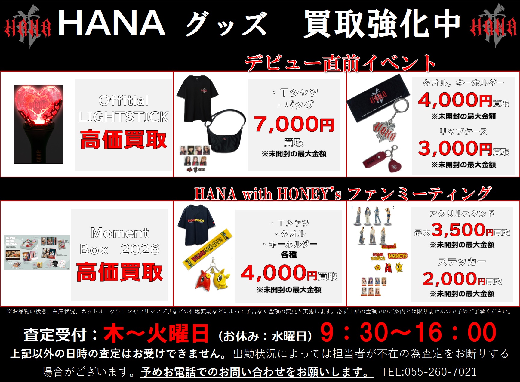 2026.02.10 こんなの買取ました! yamanashi ★HANA★グッズ買取情報 アイドルグッズ担当スタッフのいるお時間ですと査定がスムーズにご案内できます◎ ぜひ9:30~16:30のお時間にご来店ください! 2/11・2/12は担当スタッフが不在となります。 お品物や量によっては査定をお断りする場合がございます。 2/13以降でのご来店をお願いいたします。 問い合わせ TEL:055-260-7021