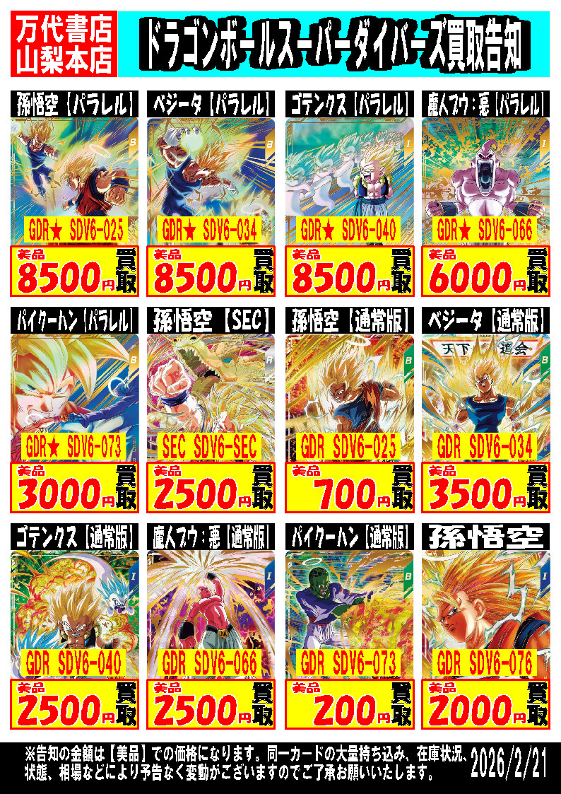 2026.02.21 トレカ yamanashi ■ドラゴンボールスーパーダイバーズ強化買取中!!■ カードコーナーより ドラゴンボールスーパーダイバーズ強化買取中!! 買取お待ちしてます!! ぜひ、お持ち込み下さい!! カードを売るなら万代書店山梨本店! 〒400-0117 山梨県甲斐市西八幡4415 TEL:055-260-7021