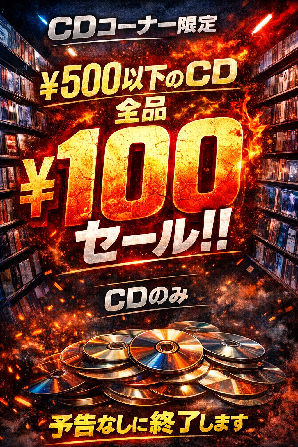 2026.03.16 イベント情報! takalab_5 ■CDコーナーより 3/17から《¥500以下のCD全品¥100セール》開催!!■ ★CDコーナーより★ 3/17からSTART!! ¥500以下のCD全品¥100セール開催いたします!! 売り切れ御免のセールです この機会にぜひお好きなCD手に入れてください!! こちらのセールはすべて¥500以下のCDのみとなります アイドルグッズ、レコード、BluRay/DVDは対象外となります お気をつけください **************** こちら↓もぜひチェックしてみてくださいね♪(*´▽`*) ・最新のイベント情報はこちら ・最新の買取情報はこちら