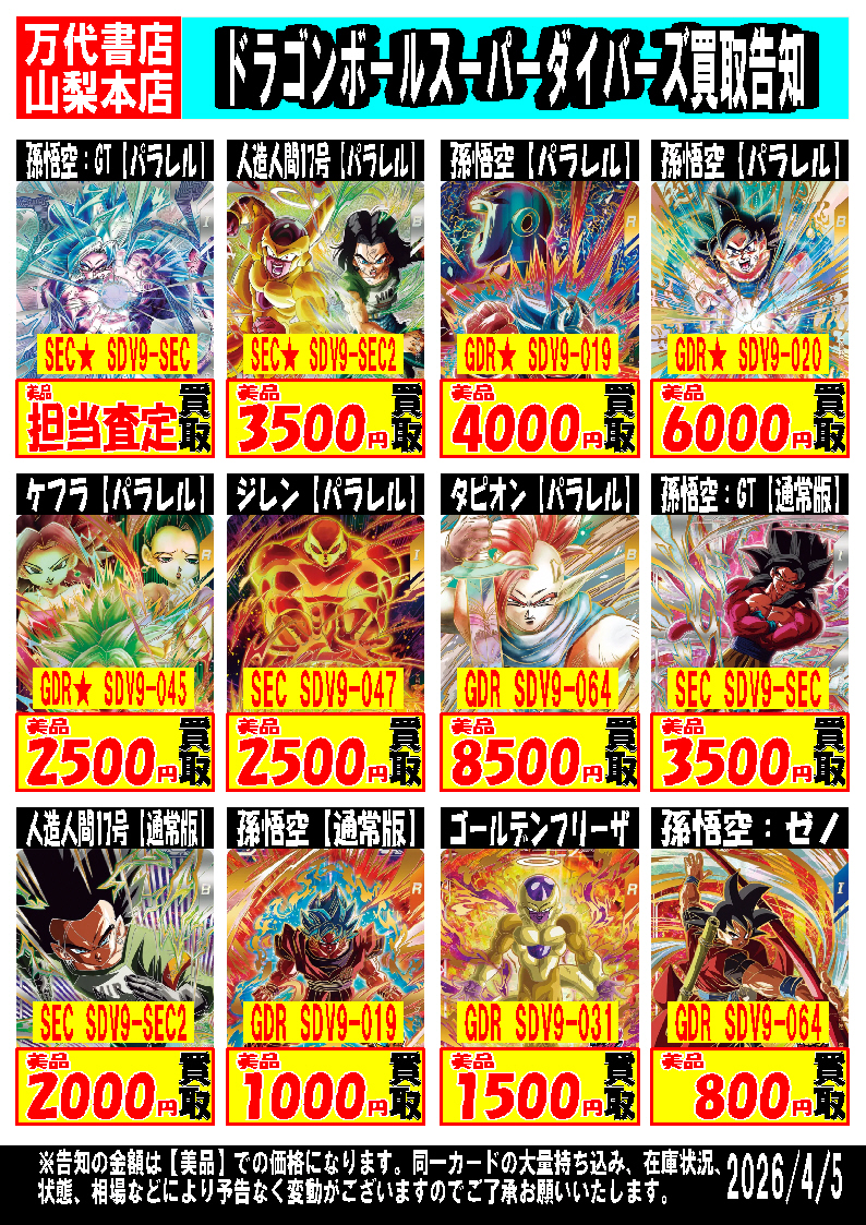 2026.04.05 カード yamanashi ■ドラゴンボールスーパーダイバーズ強化買取中!!■ カードコーナーより ドラゴンボールスーパーダイバーズ強化買取中!! 買取金額更新しました!! 買取お待ちしてます!! ぜひ、お持ち込み下さい!! カードを売るなら万代書店山梨本店! 〒400-0117 山梨県甲斐市西八幡4415 TEL:055-260-7021