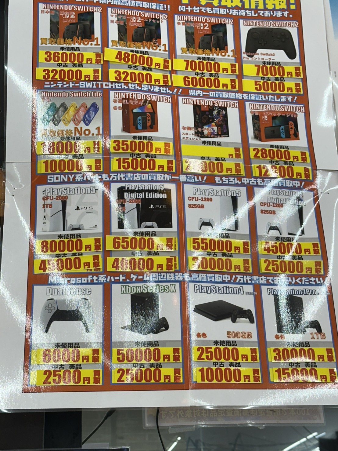 2026.04.19 買取告知 takalab_2 ★本日のゲームハードの買取金額になります!★ 本日のゲームハードの買取金額になります! 県内最高値買取保証! 何台でも買取致します! お持ち込みお待ちしております。 ※状態により上記の金額で買取出来ない場合もございます。 ご了承ください。 ※2026/4/19現在の価格となります。 在庫状況・状態によってお値段が変動いたします。予めご了承ください。 **************** こちら↓もぜひチェックしてみてくださいね♪(*´▽`*) ・最新のイベント情報はこちら ・最新の買取情報はこちら