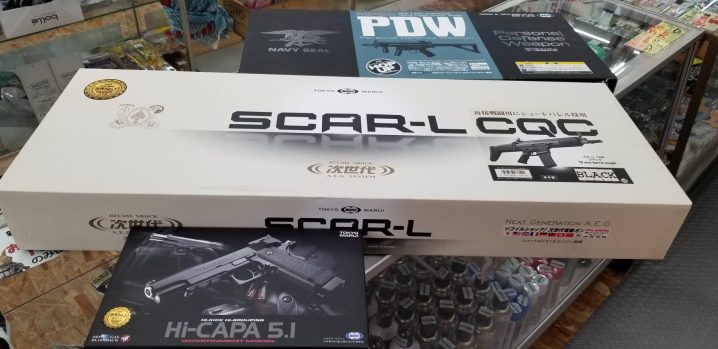 ミリタリーコーナーより。 本日は東京マルイのスカーL、MP5kPDWを品だししました! 気になるお客様は当店へ。 お待ちしております!(=゚ω゚)ノシ