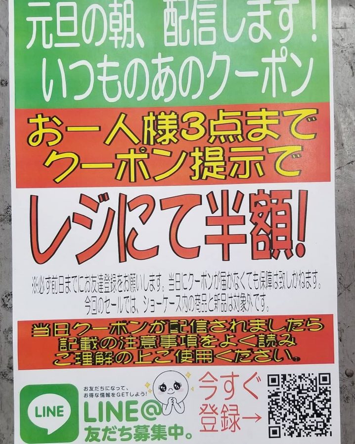 この投稿をInstagramで見る 告知です🎵 元旦は古着セール✨ LINE@のお友達に、元旦の朝 クーポンを配信します✨ お楽しみにὠ…