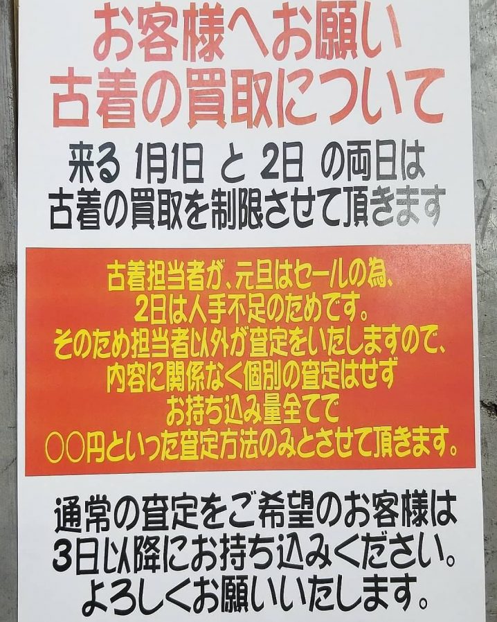 この投稿をInstagramで見る 古着を買取りご希望のお客様はお気をつけください。 本日も古着の買取りを制限させていただきます。 画像の通りとなりますので あらかじめご承知くださいませ。 よ…