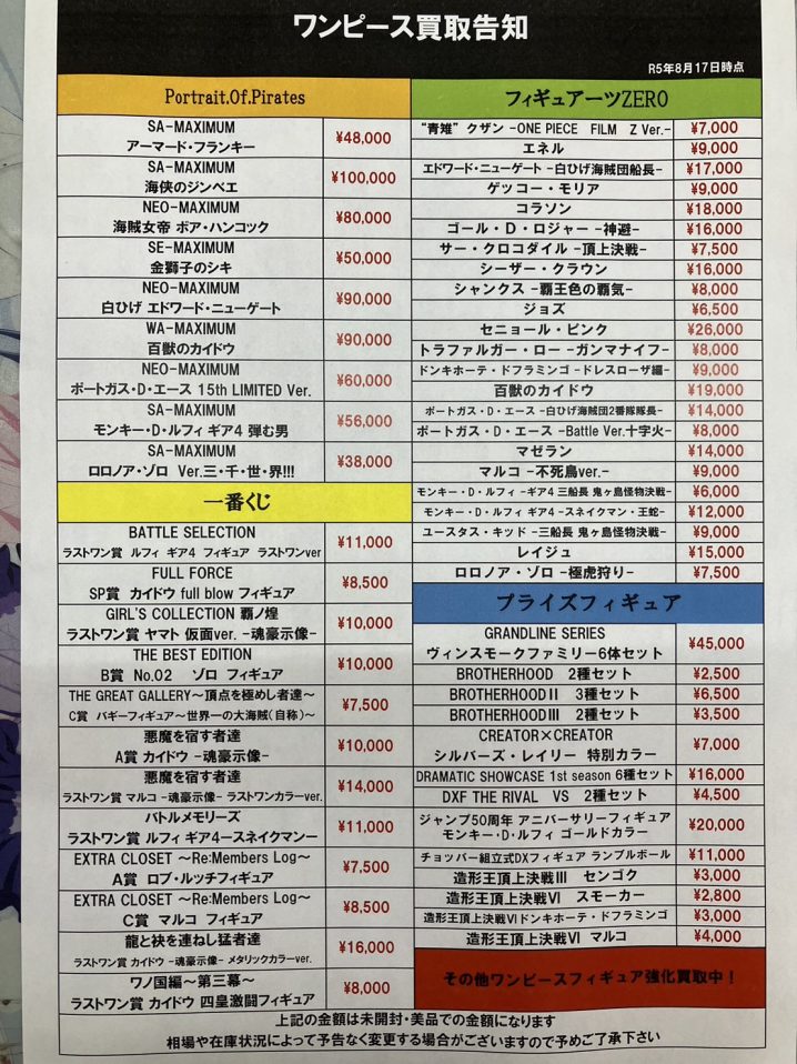 おもちゃコーナーより ワンピース強化買取中! 是非お持ち込みください! ※2023/8/17現在の価格となります。 在庫状況・状態によってお値段が変動いたします。予めご了承ください。 **************** こ…