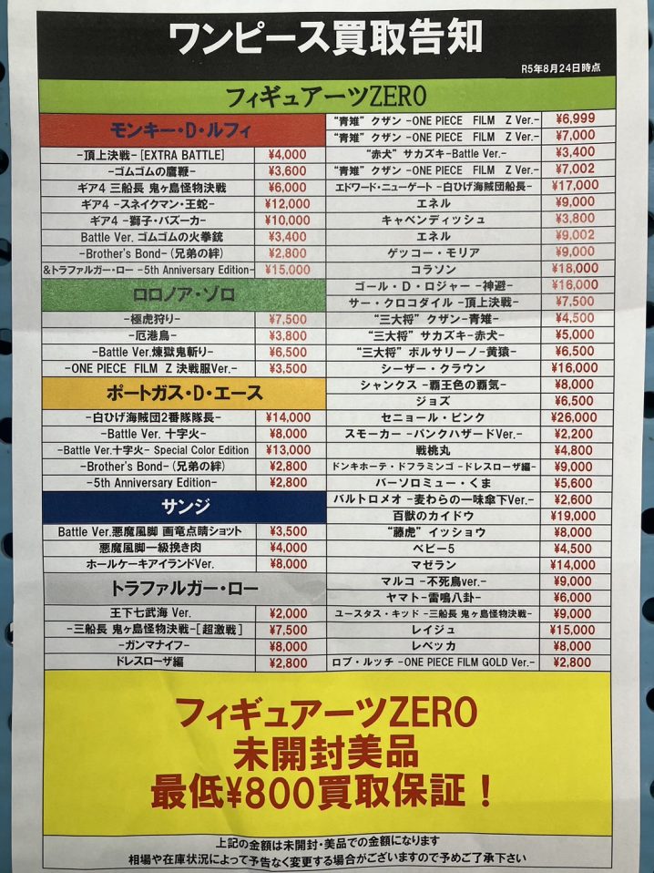 おもちゃコーナーより ワンピースフィギュアーツzeroシリーズ強化買取してます! 在庫全然足りません!どんどんお持ち込みください! ※2023/8/24 現在の価格となります。 在庫状況・状態によってお値段が変動いたしま…