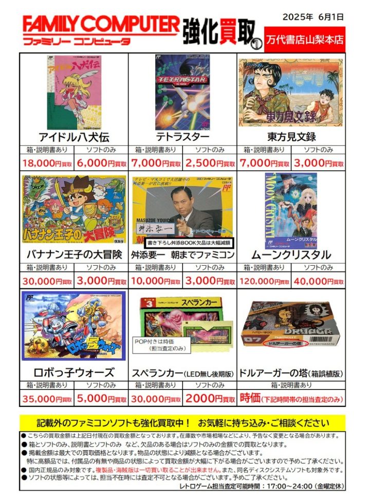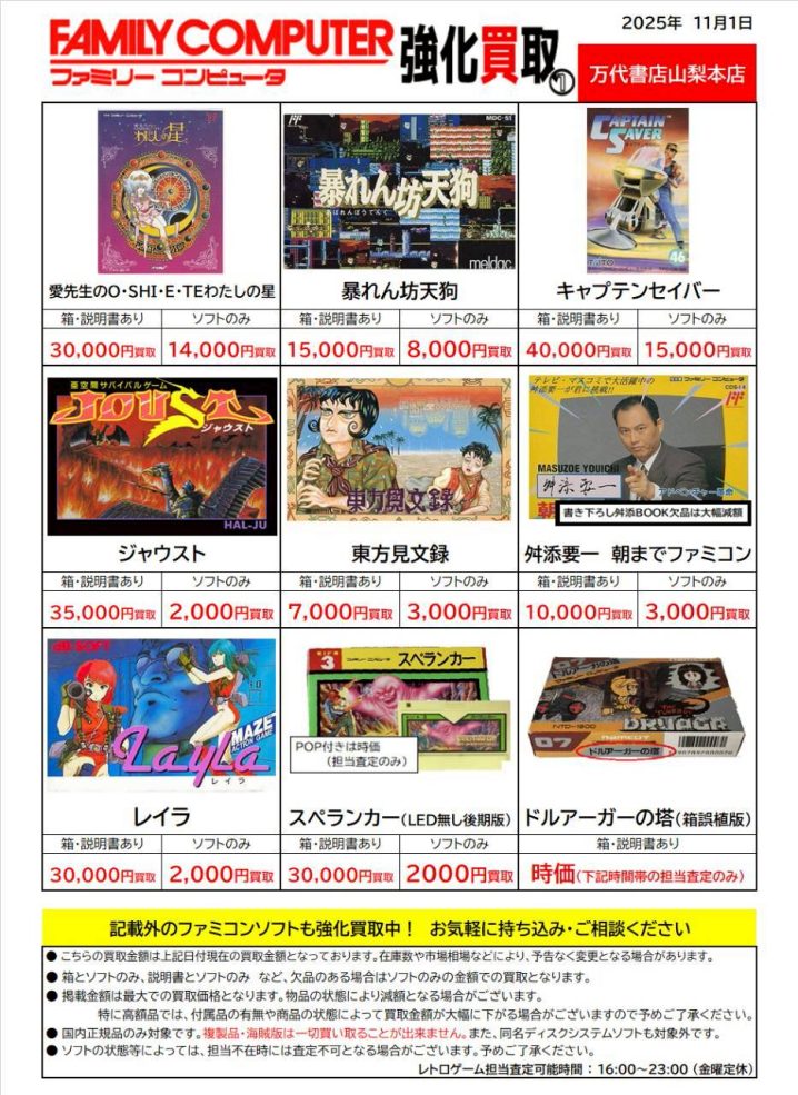 レトロゲームコーナーより! レトロゲーム特別買取チラシ更新しました! ※チラシとソフトの同時持ち込みでないと表記の金額での買取ができない場合がありますのでご注意ください チラシはレトロゲームコーナー内のラックからご自由に…