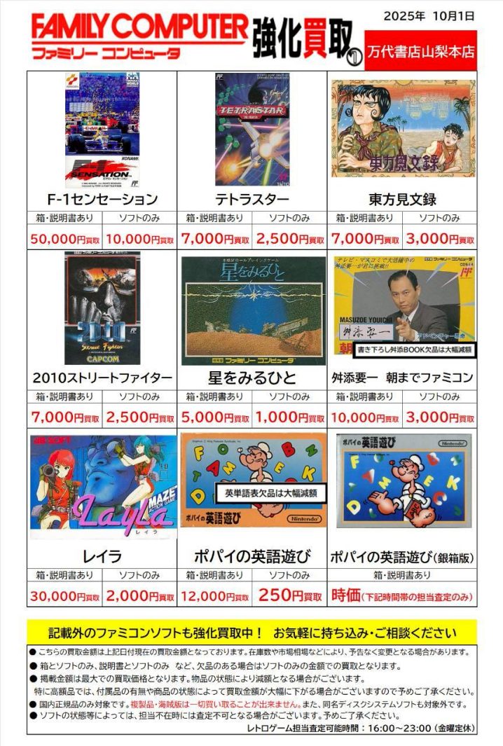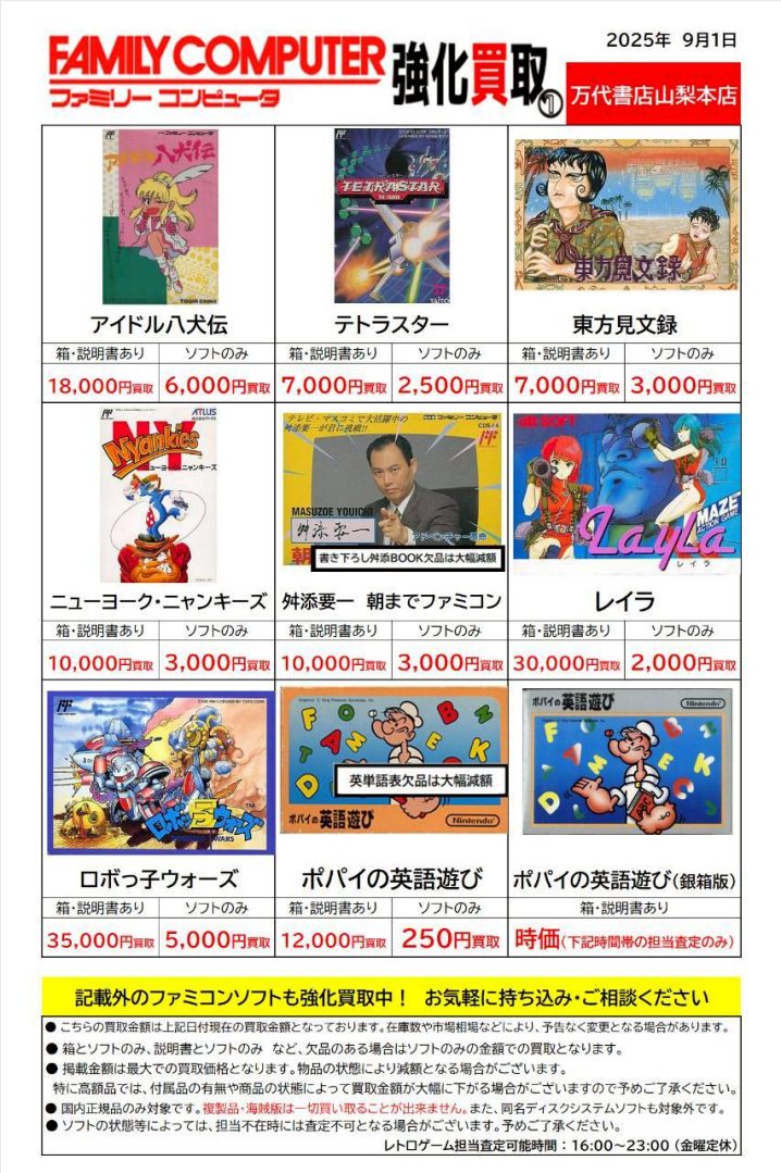 レトロゲームコーナーより! レトロゲーム特別買取チラシ更新しました! ※チラシとソフトの同時持ち込みでないと表記の金額での買取ができない場合がございますのでご注意ください チラシはレトロゲームコーナー内のラックからご自由…
