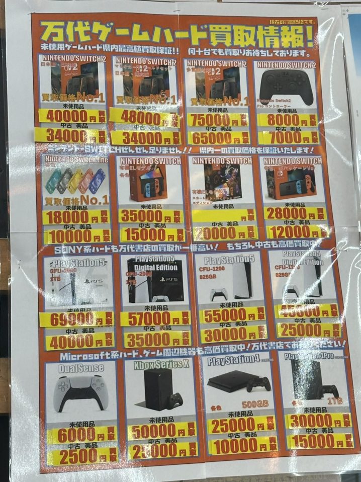 ゲームより 本日のゲームハードの買取金額になります。 県内最高値買取保証! 何台でも買取致します! お持ち込みお待ちしております。 ※状態により上記の金額で買取出来ない場合もございます。 ※2026/3/21現在の価格と…