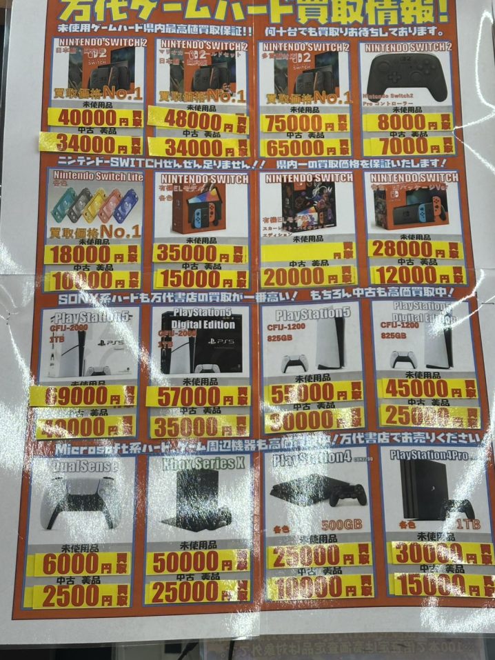 ゲームより 本日のゲームハードの買取金額になります。 県内最高値買取保証! 何台でも買取致します! お持ち込みお待ちしております。 ※状態により上記の金額で買取出来ない場合もございます。 ご了承ください。 ※2026/3…